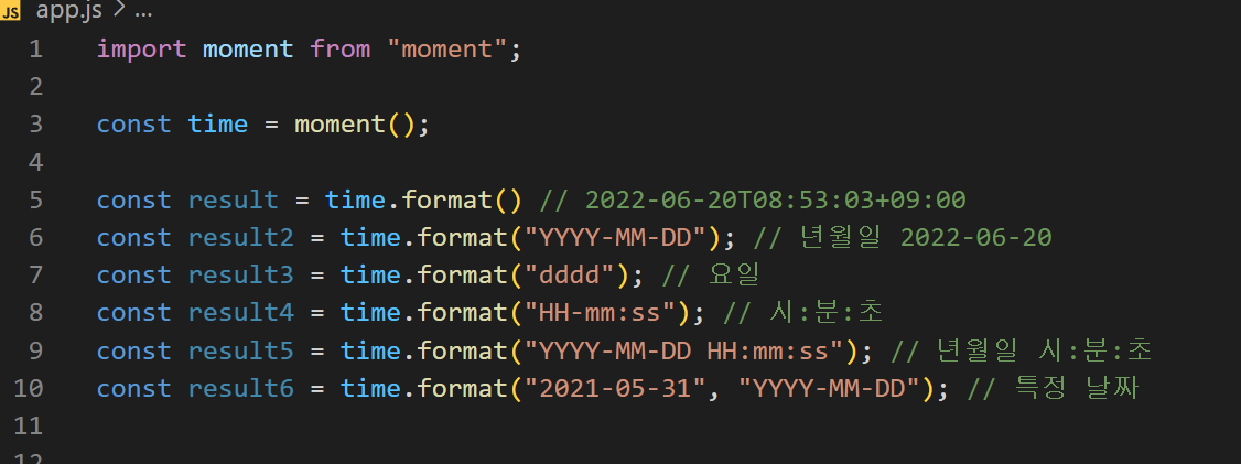 토큰 만료 기간 설정도 중 알아두면 유용한 라이브러리를 찾았다. moment는 날짜 관련 라이브러리이다. 현재는 업데이트가 중단되었지만 여전히 많이 사용한다고 한다. 자바스크립트는 Date라는 날짜 관련 객체를 제공하지만 가독성이 떨어지는 경우가 있어 moment를 사용한다고 한다. 성능 영향이 있을 수 있으니 상황에 따라 사용하면 된다.