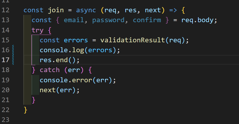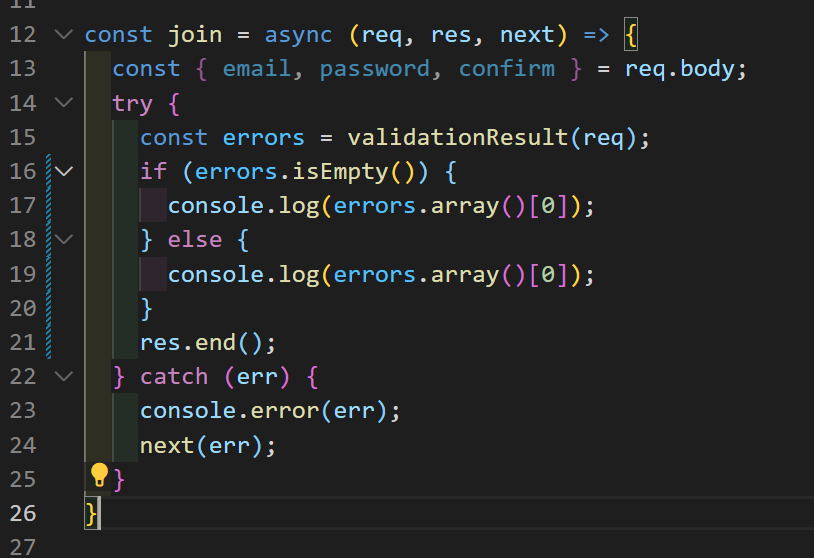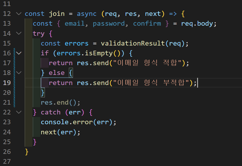 validationResult의 메서드 isEmpty는 에러 여부의 따라 불값을 리턴하는데 이를 활용해 분기 처리 할 수 있다.