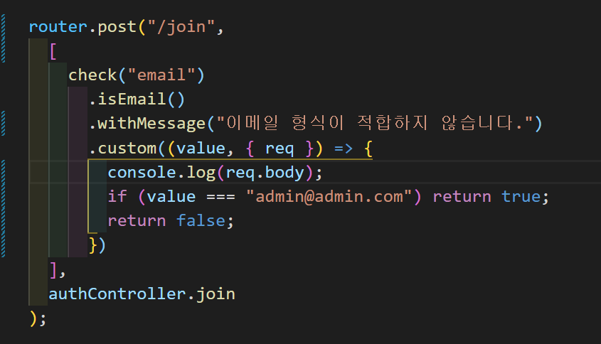 express-validator의 내장돼있는 유효성 검사 기능들은 많지만 그 내 서비스에 적합한 검사를 찾을 수 없다면 custom 메서드를 활용해 직접 검사를 커스텀 하여 사용할 수 있다. 처음 인수로 값을 넣어주는데 값은 check("email")이며 다음 인수로 req 객체를 구조 분해하여 넣어준다. req는 기본적으로 미들웨어에서 사용하는 req 객체다. 커스텀 검사에 리턴 값에 따라 라우터 validationResult(req)가 에러 여부가 결정된다. 커스텀 검사는 불값과 프로미스를 반환할 수 있다.
