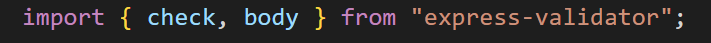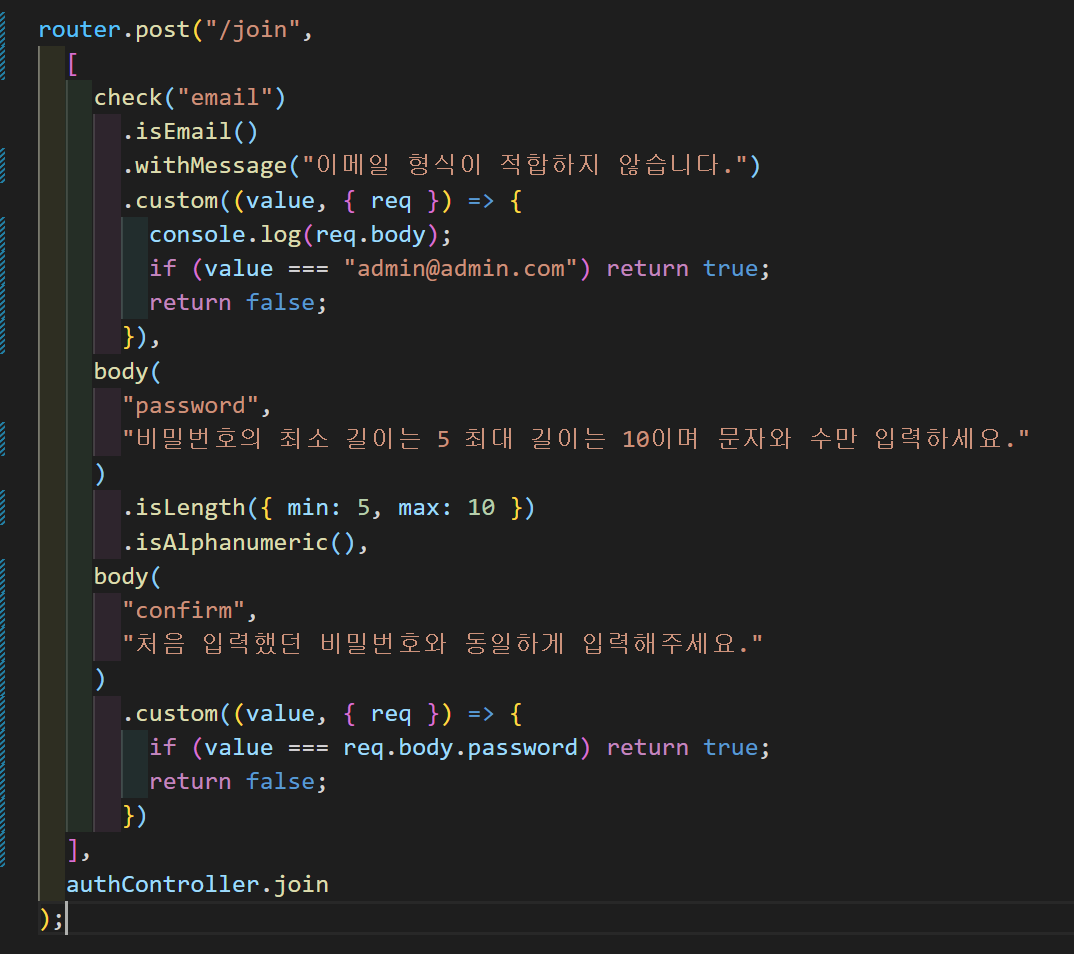 express-validator는 미들웨어이다. 라우터에 유효성 검사 미들웨어를 추가하고 검사 결과를 컨트롤러에서 처리한다. 객체 속성 중 check와 validation을 구조 분해하여 임포트 하는데 check는 라우터 validation은 컨트롤러에 임포트 한다. express-validator에는 수많은 유효성 검사를 할 수 있는 내장 메서드들이 있으므로 공식 문서를 참고하면 된다.