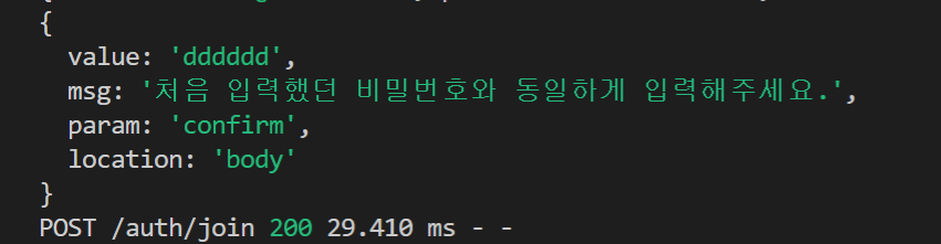 커스텀 유효성 검사에 조건이 만족하여 트루를 리턴하므로 에러 메세지가 출력되지 않고 req 객체에 body 값도 확인할 수 있다.