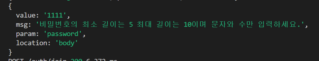 위에서 언급했지만 check 메서드는 body query params header cookie를 검사한다. body만 원할 경우 따로 임포트 하여 사용할 수 있다. check와 마찬가지로 인수의 폼 데이터의 입력한 속성값을 넣어준다. 패스워드의 최소 길이는 5 최대 길이는 10이며 특수기호는 사용 불가하며 문자와 수만 입력 가능하다.