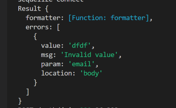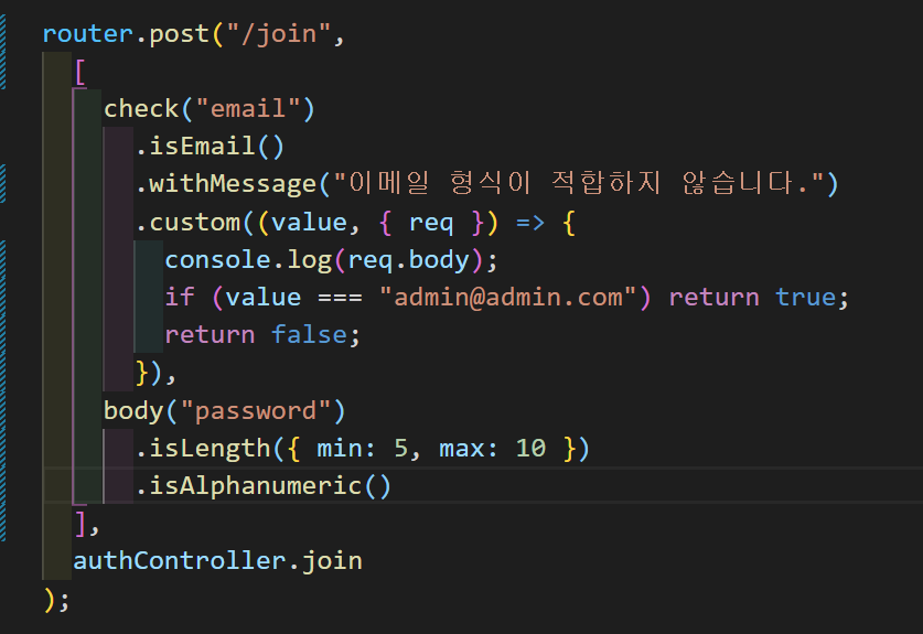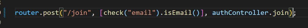 check의 인수로 검사하고자 하는 폼 데이터 입력 속성(name) 값(value)을 넣는다. check는 기본적으로 body query params header cookie를 검사한다. check의 기본 메서드로 이메일 형식을 검사하는 isEmail을 넣어주면 입력값이 이메일 형식인지 검사한다. 검사 과정에서 발생한 에러는 컨트롤러에 validationResult에 인수로 req를 넣어주면 검사에서 발생한 에러를 객체로 반환한다.
