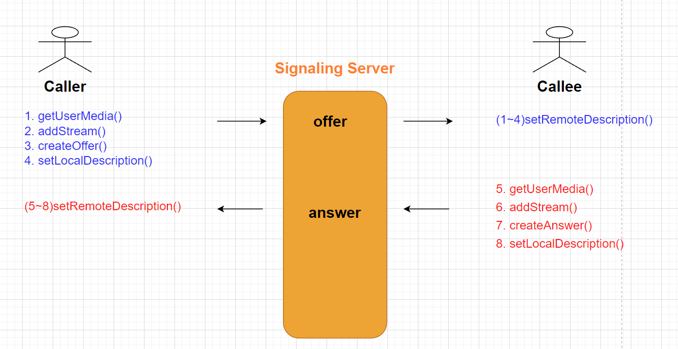 발신자(Caller)가 수신자(Callee)에게 연결 여부(Offer&Answer)를 묻게 된다.