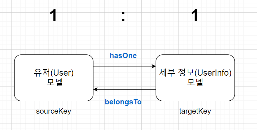 - 유저 모델 hasOne/sourceKey 세부 정보 모델 belongsTo/targetKey