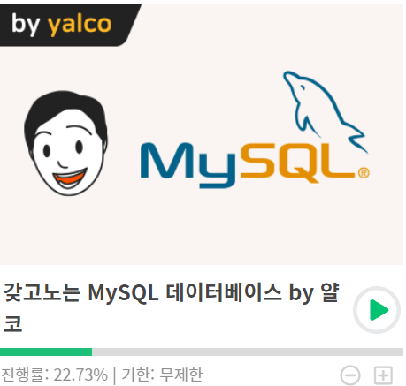 오늘은 화요일에 결제한 인프런 MySQL 강의를 처음 듣기 시작했다. 얄팍한 코딩 사전이라는 유튜버의 강의이다. 전반적인 프로그래밍 기본 개념을 초보자 입장에서 재치 있게 잘 설명해 주신다. 강의의 장점이라 하면 코드 설명에서 끝나 게 아니라 그 코드를 직접 실행해 보면서 응용하는 방법까지 자세하게 설명해 주신다. 근대 말의 속도가 조금 많이 빨라 0.75배로 듣고 있다. 하지만 문제없다. 강의 내용이 이해하기 좋게 구성되어 있어 여러 번 돌려보면서 수강할 계획이다 쿼리라고는 셀렉문만 간단하게 알고 있었는데 이번에 셀렉문에대해 조금 더 많은 사용법을 알게 되었다. 에스큐엘은 건에 맞는 데이터만 조회하는 아주 간단한 언어로 알고있었는데 막상 직접 공부하고 실습해 보니 간단한게 아니었 조회 상상할 수 없는 여러 개의 조건을 걸어 할 수 있고 사칙연산 문자 시간 날짜 등 다양한 메서드가 있었다. 나는 ORM으로 데이터베이스를 조작하는 방법을 처음 배웠다. 당시 강의에서 제로초님이 편한 ORM만 사용하다 보면 언젠가 대가를 치를 거라고 하셨는데 지금이 그 시기인 거 같다. 그래도 ORM을 어느 정도 이해한 상태라 강의를 보는데 공통점이 많아 다행이었다. 아직까지 테이블 관계 설정과 조인 트랜잭션을 배우지 않아 괴롭지 않지만 조만간 배울 거 같다.