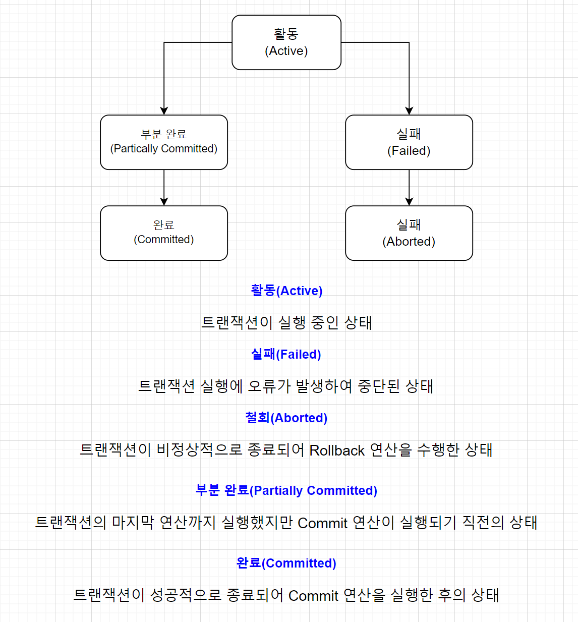 데이터베이스의 상태를 변화시키기 위해 수행하는 작업의 단위 또는 한 번에 수행되어야 할 일련의 연산들을 의미한다.