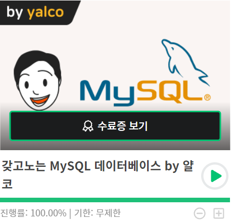 5일에 걸쳐 MySQL 강의를 완강했다. 사실 이틀이면 다 들을 수 있는 강의였는데 평일에 공부 시간도 줄고 배운 개념들을 그날 그날 포스팅하느라 조금 늦어졌다. 이 강의로 MySQL에 대해 깊은 개념은 아니지만 SELECT 문에 대한 응용과 테이블 설정 인덱스 트랜잭션 등 한 사이클을 빠르게 돌았다. 나머지는 배운 개념을 활용하여 더욱더 깊이 파고들어야 할 일만 남았다. 기존 Sequelize ORM으로 만든 개인 프로젝트가 있는데 이번 기회에 로우 쿼리로 다시 만들어볼 계획이다. 직접 만들면서 MySQL을 익히고 ORM의 장단점들을 파악할 수 있을 거 같다.