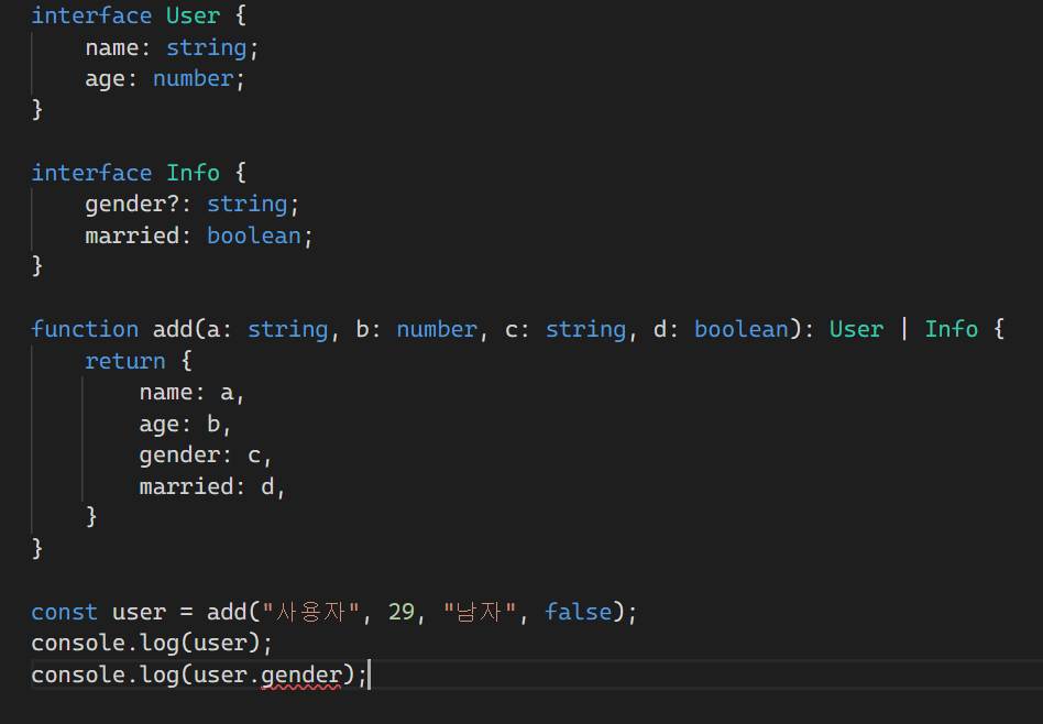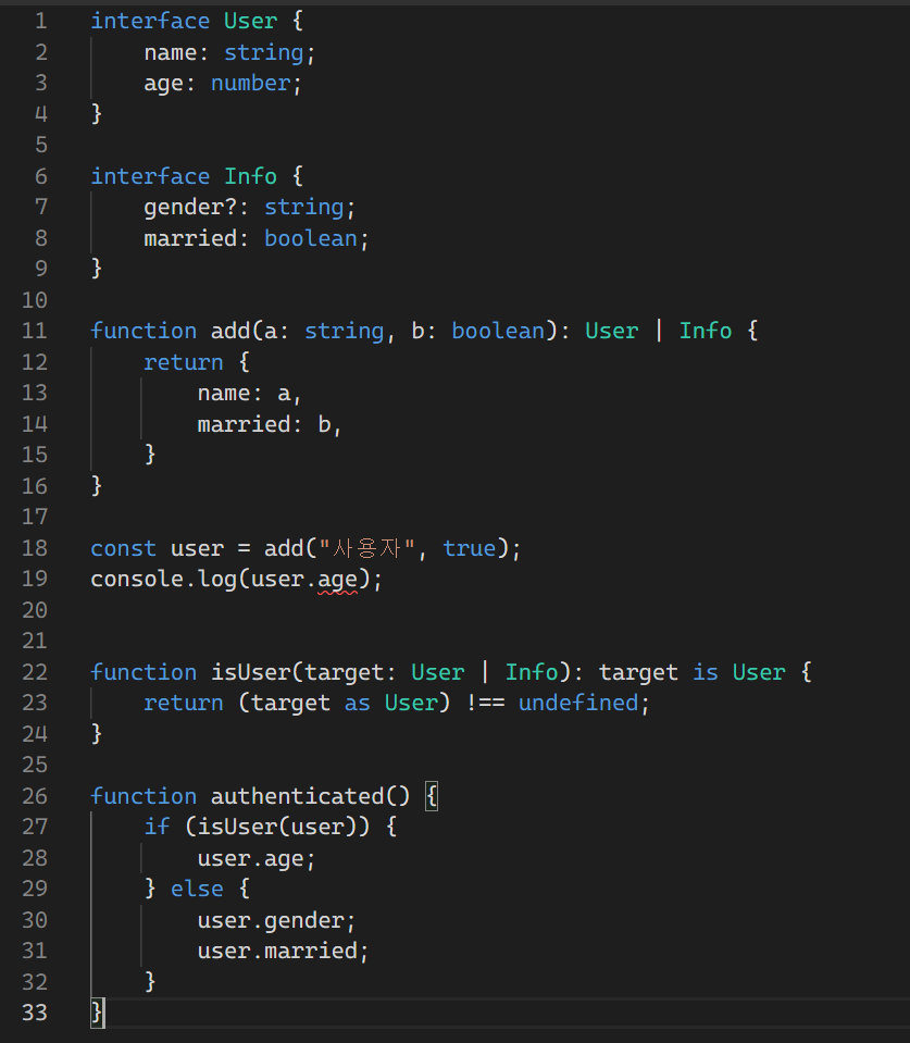 - 인터페이스 User / Info 유니온 타입의 객체를 리턴하는 함수를 사용 후 두 인터페이스의 공통으로 정해진 속성이 아닌 속성에 접근할 경우 에러가 난다.