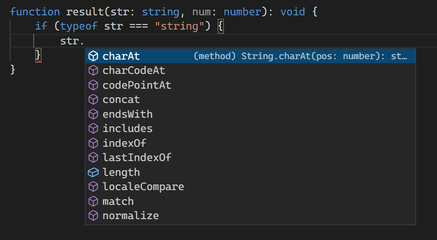- 조건문 안에서 매개변수 str 타입이 문자열(string)이므로 문자열 메서드를 사용할 수 있다.